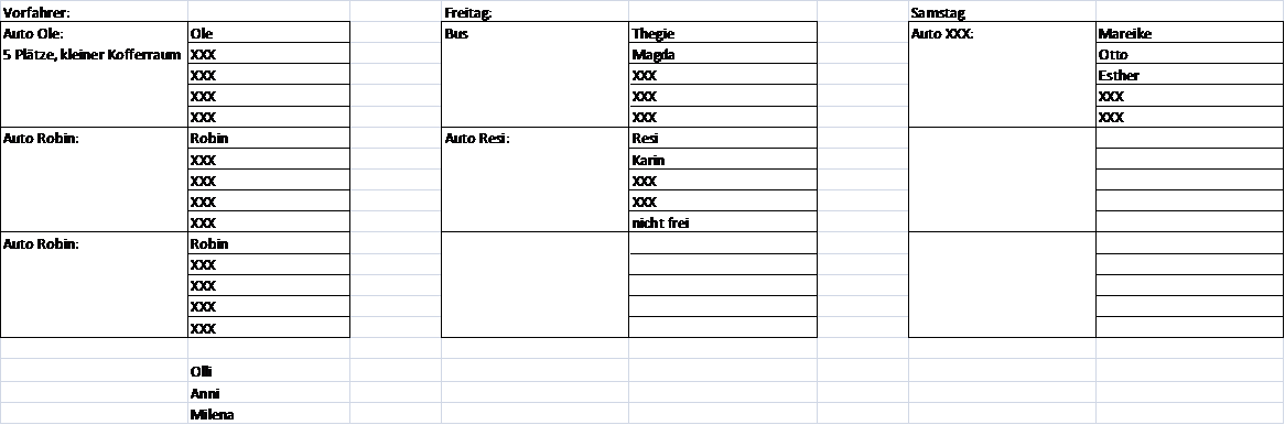 stehen, wann die mitfahren wollen und ggf. ein Auto anbieten können.